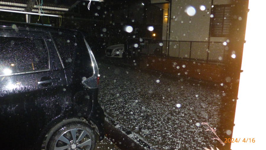 4月16日20時10-30分雹が3-5cm大の!!雨樋。車庫のスレート、車 凸凹。